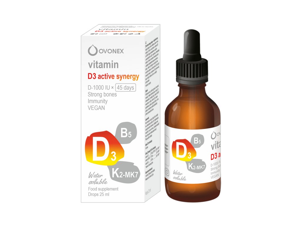 Kapky obsahují vodou ředitelnou aktivní formu vitaminu D3, který v součinnosti s vitaminy B5 a K2-MK7 reguluje metabolismus vápníku a napomáhá jeho využití v organismu. Nedostatek vitaminu D3 vede k narušené mineralizaci kostí v důsledku nedostatečné absorpce vápníku a fosforu. Vitamin D3 přispívá k normální funkci imunitního systému a ovlivňuje okolo 200 různých chemických reakcí v organismu. Bez konzervantů, lepku, laktózy, alkoholu, barviv a umělých dochucovadel. Vhodné pro vegany.